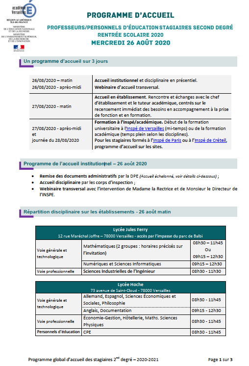 Veuillez trouver ci-dessous, le programme d’accueil, au sein de l’Académie de Versailles, des professeurs/personnels d’éducation stagiaires du second degré pour la rentrée scolaire 2020.