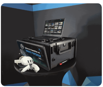 Valise rigide sur roulettes avec le casque de réalité virtuelle et les manettes.