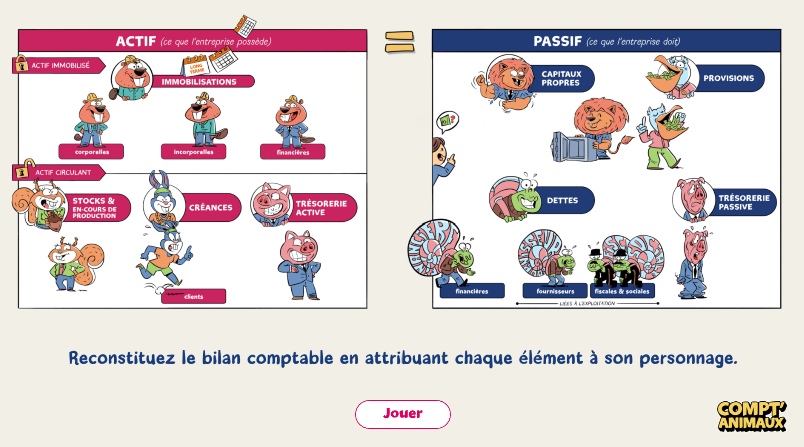 Ce deuxième jeu transpose la construction du bilan dans un univers ludique et métaphorique, celui des “comptanimaux”. Cette mise en contexte originale permet :