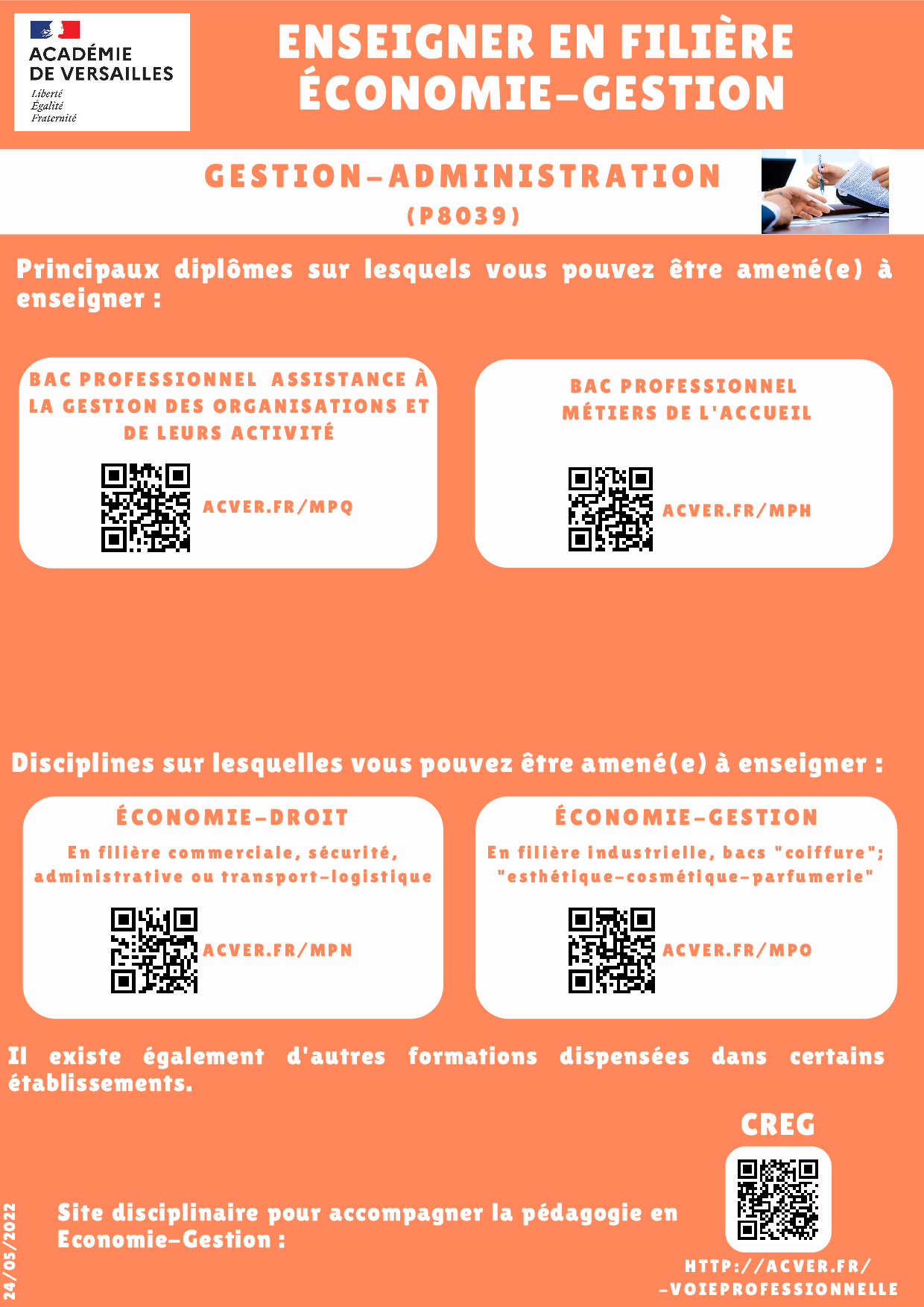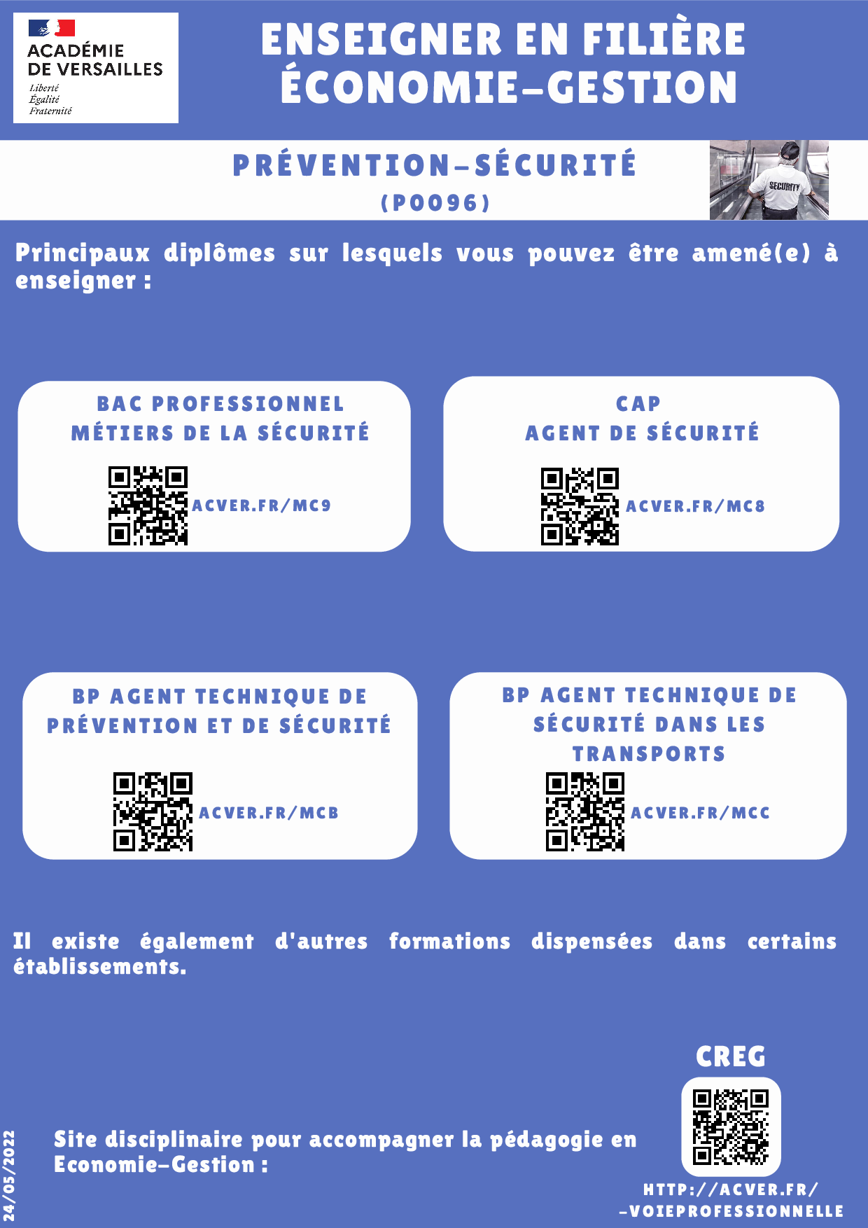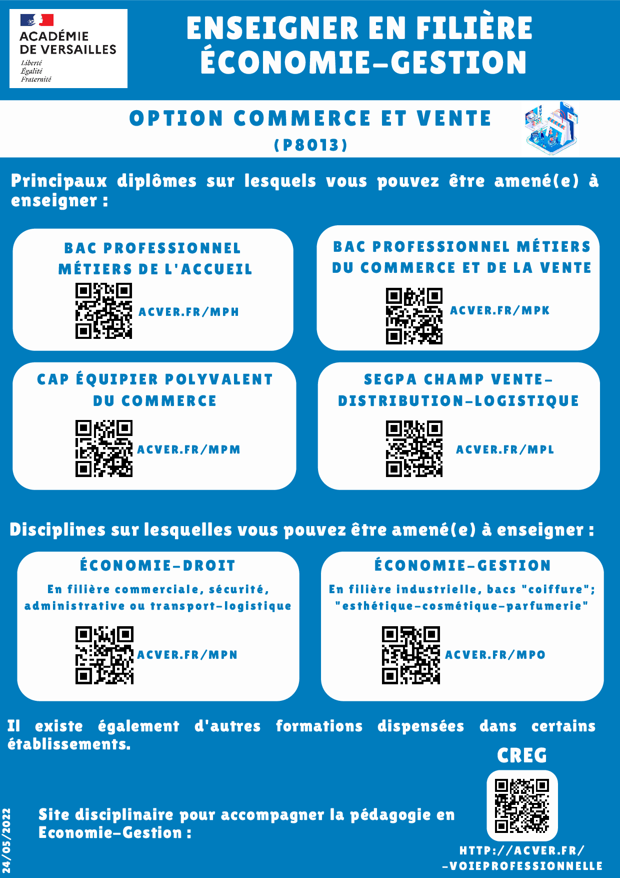 Vous retrouverez, dans ces infographies, les principaux diplômes et disciplines sur lesquels vous pouvez être amené(e) à enseigner en fonction de l’option de recrutement : Commerce et vente ; Gestion-Administration, Transport-Logistique ou Prévention-Sécurité.